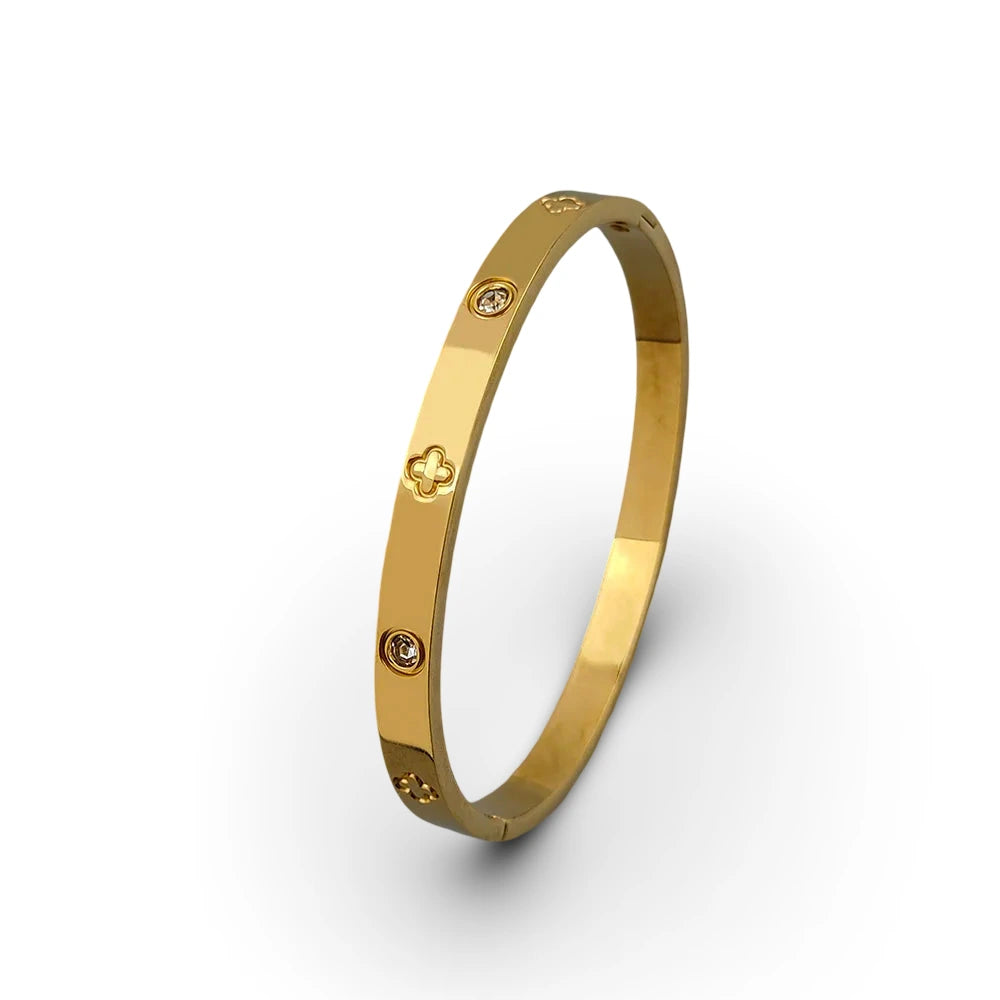Este brazalete con motivos florales es un detalle especial para celebrar la belleza y la elegancia. Su diseño liso, combina detalles florales grabados con zirconias que añaden un brillo sutil. Es el complemento ideal para un look sofisticado de día o para destacar en cualquier ocasión especial. Perfecto para regalar o llevar contigo como símbolo de armonía y estilo.