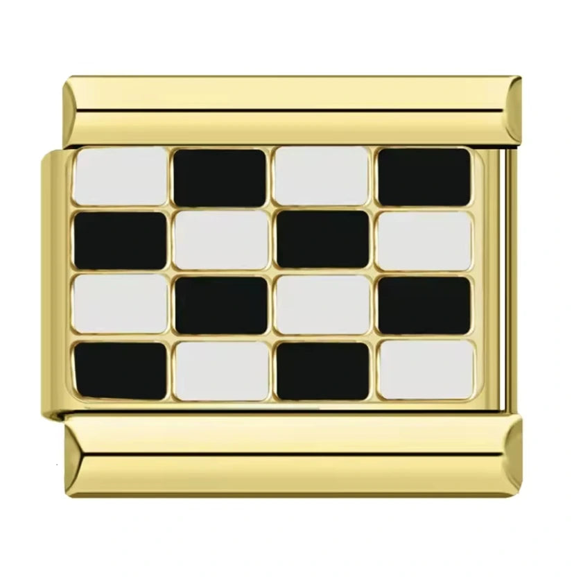 Este charm italiano con patrón ajedrezado es un detalle especial para añadir un toque único a tu colección de joyas. Su diseño en oro resalta con un juego de contrastes negro y blanco que evoca elegancia y sofisticación. Es el complemento ideal para personalizar tu brazalete favorito, perfecto para regalar o llevar contigo como símbolo de estrategia y estilo.