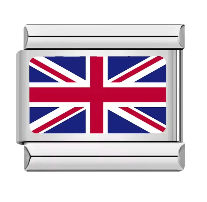 Este charm italiano con diseño de la bandera del Reino Unido es una pieza elegante que simboliza el orgullo nacional. Fabricado con materiales de alta calidad, presenta el icónico diseño de la Union Jack con sus franjas rojas, blancas y azules, representando la historia y la unión de las naciones británicas. Ideal para personalizar pulseras o collares, es perfecto para quienes desean llevar su herencia británica o celebrar su cultura en cualquier ocasión. Su diseño duradero y versátil lo hace adecuado para uso diario o como regalo significativo.