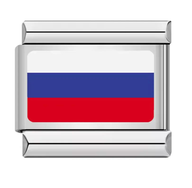 Este charm italiano con diseño de la bandera de Rusia es una pieza elegante que representa el orgullo nacional. Fabricado con materiales de alta calidad, presenta las franjas horizontales blanco, azul y rojo, simbolizando la paz, la lealtad y el valor del país. Ideal para personalizar pulseras o collares, es perfecto para quienes desean llevar su herencia rusa o celebrar su cultura en cualquier ocasión.