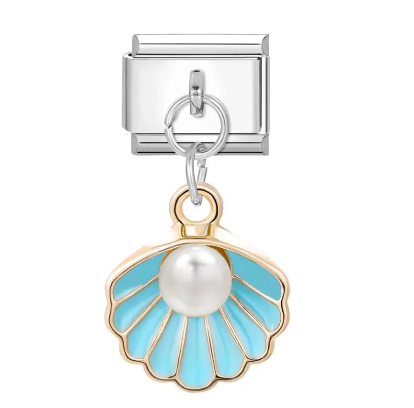 Este charm italiano con colgante de concha y perla es una pieza elegante que combina un diseño marino con un toque de lujo. Fabricado con materiales de alta calidad, presenta una concha azul brillante con detalles dorados y una perla central, simbolizando la belleza natural y la sofisticación. Ideal para personalizar pulseras o collares, es perfecto para quienes buscan un accesorio versátil con un estilo acuático. Su diseño duradero y encantador lo hace adecuado para uso diario o como regalo especial.