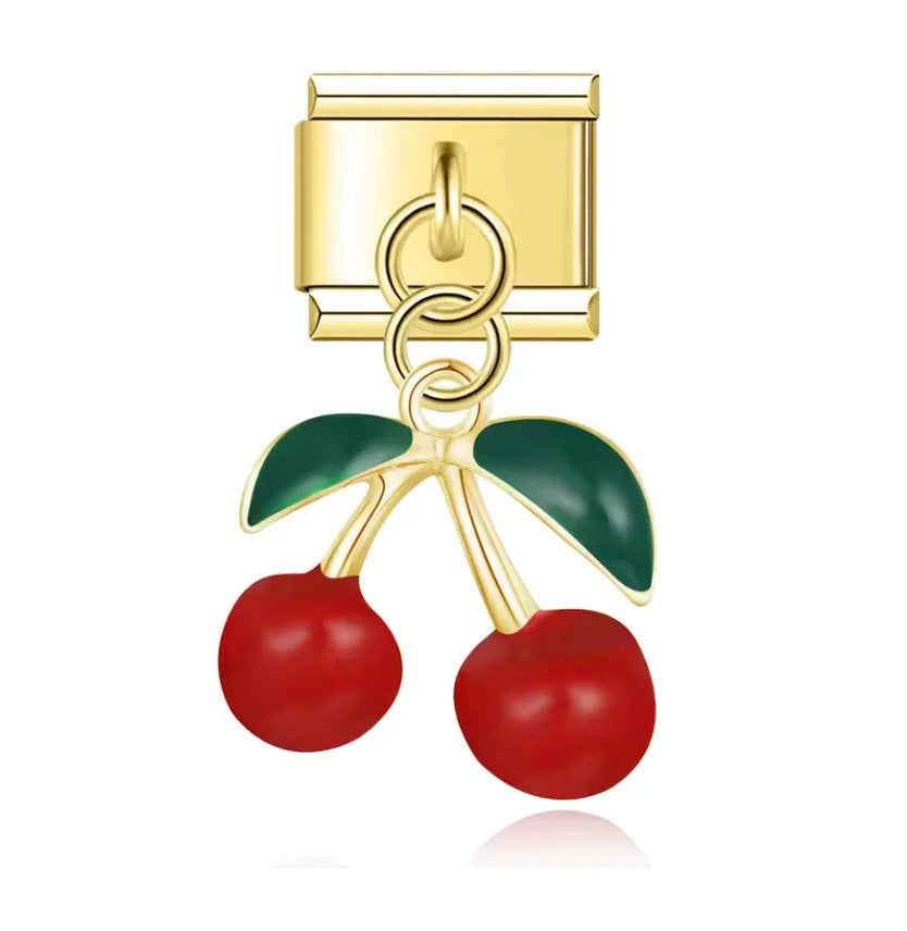 Este charm italiano dorado con colgante de cerezas es una pieza elegante que evoca frescura y alegría. Fabricado con materiales de alta calidad, presenta un diseño de cerezas estilizadas en tonos dorados, simbolizando dulzura y vitalidad. Ideal para personalizar pulseras o collares, es perfecto para quienes buscan un accesorio versátil con un toque frutal. Su diseño duradero y refinado lo hace adecuado para uso diario o como regalo especial.