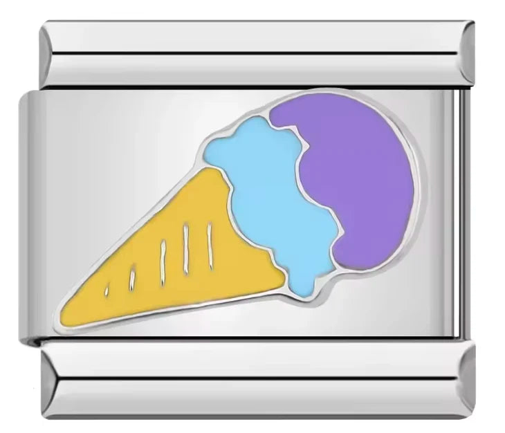 Este Charm italiano con charm de helado de colores ofrece un diseño fresco y alegre. Su fondo plateado resalta los tonos azul, morado y amarillo, perfecto para personalizar con charms italianos y disfrutar en cualquier momento.